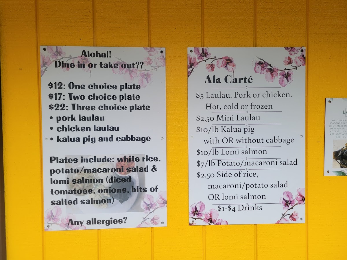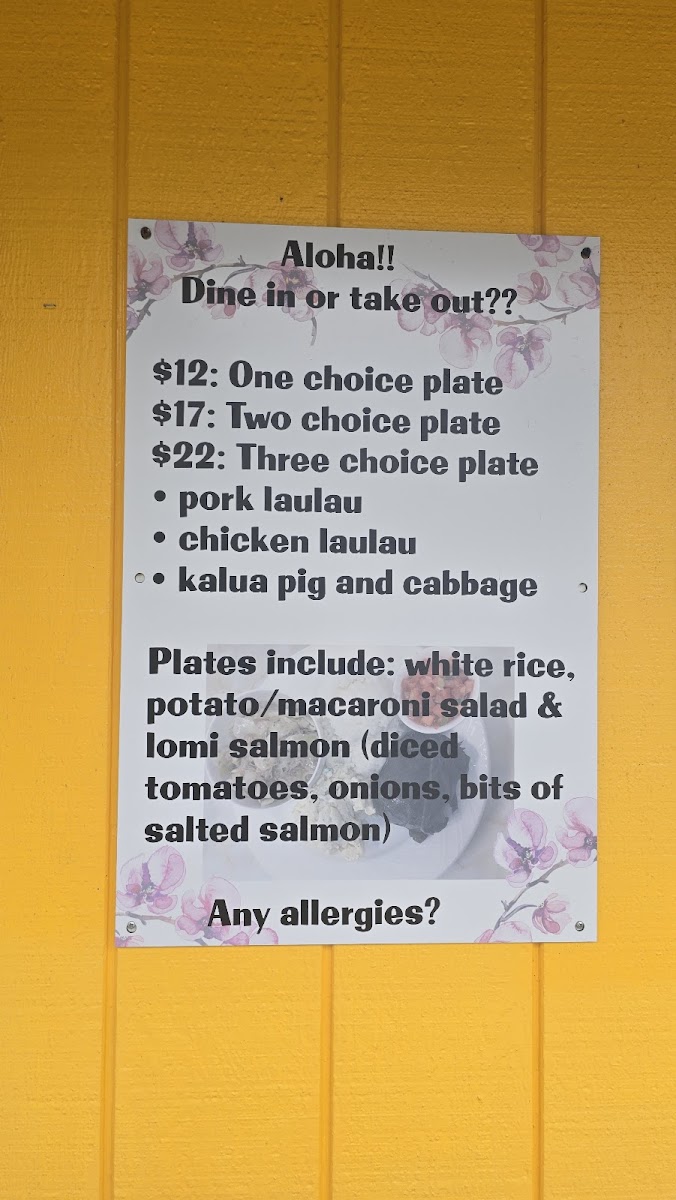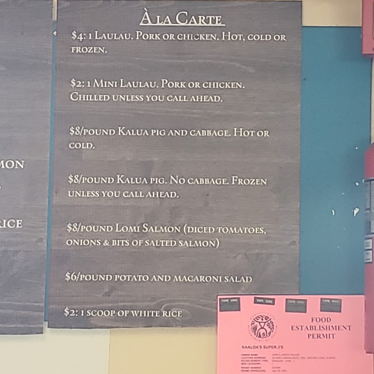 Welcome to Kaaloa's Super J's, a hidden gem nestled on the Big Island of Hawaii. This charming establishment specializes in authentic Hawaiian cuisine, showcasing delectable offerings like Pork and Chicken Lau Lau, and succulent Kailua Pork. Priced affordably, their combo plates provide a delightful sampling of Hawaii's culinary heritage at just $12. Each plate is served with white rice, lomi salmon, and creamy potato-macaroni salad, creating a comforting meal that captures the essence of island life.